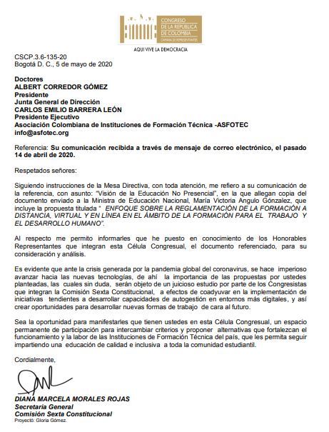 Noticias asfotecPosted on 7 mayo, 20207 mayo, 2020 By asfotec_colombiaComisión VI Cámara Colombia responde propuesta ASFOTEC Comisión Sexta responde propuesta sobre modalidad distancia y no presencial para ETDH seguimos trabajando en propósito de reglamentar.