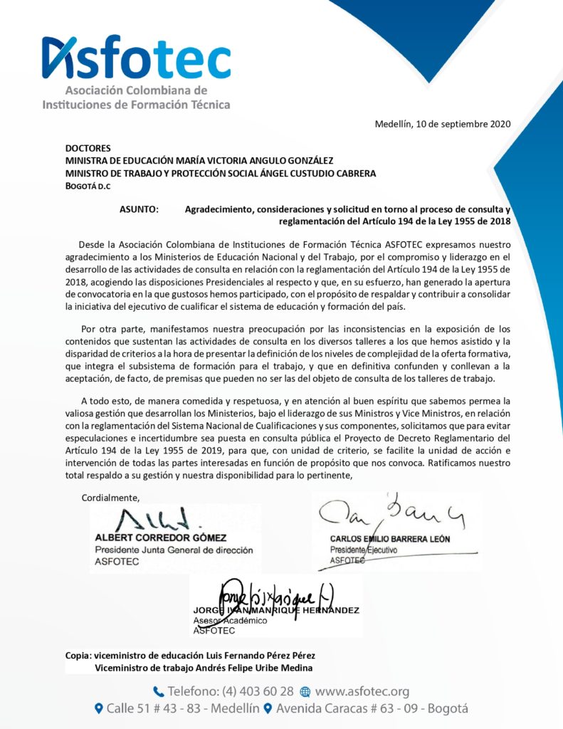 Mediante comunicado dirigido a los ministros de educación y trabajo la Asociación Colombiana de Instituciones de Formación Técnica ASFOTEC solicitó al gobierno nacional colocar a consulta pública el proyecto de decreto que reglamenta el artículo 194 del plan de desarrollo que tienen que ver con la implantación del Sistema nacional de cualificaciones, lo anterior a raíz de varios espacios académicos que se han dado de manera independiente por cada cartera ministerial donde se observa que hay disparidad de criterios en el diseño de los marcos de cualificaciones, en especial el de Tics que produjo malestar entre los directivos de instituciones ETDH.